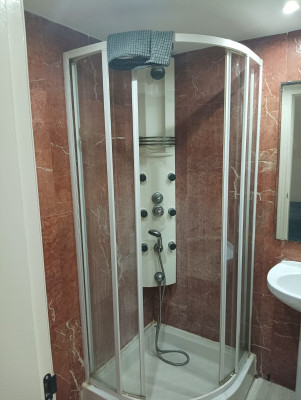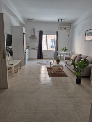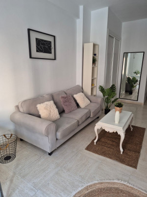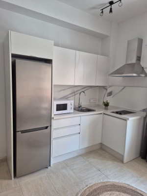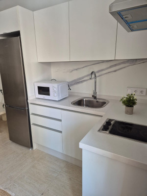 Luminoso y moderno salón-comedor con TV, con cama doble. Cocina completamente equipada con electrodomésticos (microondas, nevera, vitrocerámica, lavadora). Termo eléctrico. Un baño íntegro con plato de ducha.