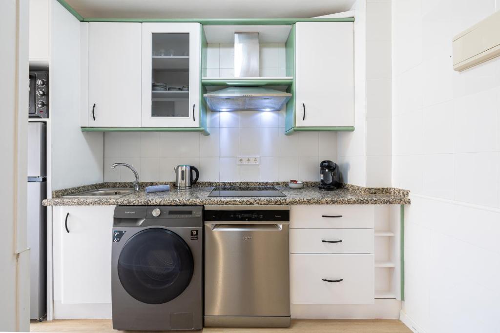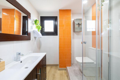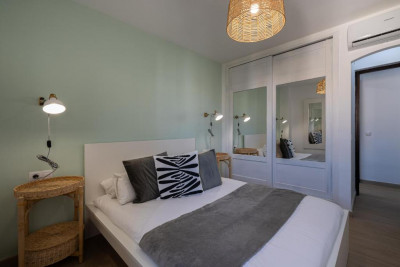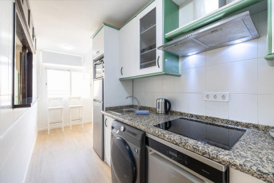 Amplio y luminoso salón-comedor con TV. Cocina moderna y abierta totalmente equipada (horno, microondas, vitrocerámica, nevera, lavadora-secadora, lavavajillas). Dos dormitorios, el principal con cama de matrimonio y aire acondicionado, y el segundo dormitorio con dos camas individuales, ambos con armarios empotrados. Moderno baño íntegro con ducha y con un aseo.