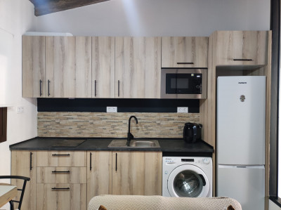 Salón-comedor con TV. Cocina amuebla con nevera, microondas, vitrocerámica y lavadora.